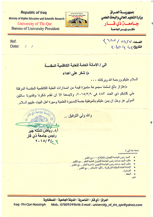 جامعة ذي قار تقدم شكرها وتقديرها إلى الأمانة العامة للعتبة الكاظمية المقدسة