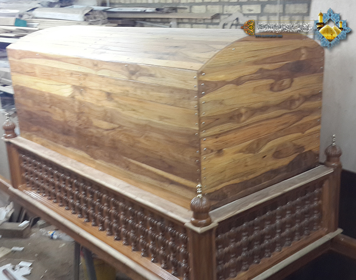 وكان الحدث الأبرز في هذه المراسم التشييع المهيب للنعش الرمزي للإمام الجواد (عليه السلام)، حيث ارتأت الأمانة العامة للعتبة الكاظمية المقدسة هذا العام تهيئة هذا النعش المبارك داخل العتبة المقدسة للمشاركة به في إحياء هذه الشعيرة المقدسة داخل الصحن الكاظمي الشريف، وتأتي هذه المبادرة من قبل العتبة الكاظمية المقدسة حرصاً منها على ضمان أكبر انسيابية ممكنة لمشاركة الجموع المليونية المعزية في مثل هكذا مناسبات، وتجنب الوقوع في بعض الإشكالات والخروج عن طبيعة وأصالة المراسم المقدسة التي امتازت بالالتزام بفكر ونهج مدرسة أهل البيت (عليهم السلام) الرسالي القويم، كما تهدف إلى عدم تسييس هذا الذكرى وإفراغها من محتواها الفكري والعقائدي، هذا فضلاً عن التلازم والترابط المعنوي والروحي للنعش الرمزي كونه مولودا من رحم الفاجعة وأرض القداسة في رحاب الإمامين الكاظمين (عليهما السلام). ولخصوصية وأهمية هذا العمل المبارك تم وضع آلية تنفيذ وتصميم خاص يختلف عن باقي الأعمال الأخرى، وصبت الكثير من الجهود والإمكانات في عمل النعش الرمزي للإمام الجواد والإمام الكاظم (عليهما السلام) لما له من أهمية ومكانة كبيرة، وارتباطه بصاحب ذكرى أليمة وفاجعة كبرى التي ألمت بالأئمة لفقدها تاسع أئمة الهدى الإمام أبي جعفر محمد بن علي الجواد )عليه السلام)، تم مراعاة الجانب الروحاني وإحساس المتلقي والمشاهد له بقداسة وعظمة وكرامة الإمام من خلاله. وفيما يخص أعمال صناعة الهيكل والمساند الخشبية والحديدية فقد وضعت التصاميم والشكل المحدد لصنع النعش الرمزي للمشاركة به في إحياء ذكرى استشهاد الإمامين موسى بن جعفر ومحمد بن علي الجواد (عليهما السلام)، وعرضه على إدارة العتبة الكاظمية المقدسة لأجل استحصال الموافقة على إنجازها، كما تم تهيئة المواد الداخلية في صنع الصندوق الخشبي والهيكل الحديدي الذي يتم تركيبه على الصندوق، وشملت مراحل العمل صنع الهيكل الحديدي لزيادة قوة تحمل النعش وضمان عدم تعرضه للضرر أثناء أداء مراسم التشييع المباركة، وبعدها تم تغليف هذا الهيكل الحديدي بالخشب من نوع الساج (البورمي) وعمل أرضية أو قاعدة تحاط بأعمدة قصيرة مرتبة على شكل سياج يحيط بالصندوق الخشبي، كما وضع في الأركان الأربعة للنعش الشريف أربعة أعمدة نقشت على شكل مآذن مشابهة لمآذن الصحن الكاظمي الشريف، واختتم عمل النعش بالجزء العلوي أو الهيكل الرئيس للنعش الذي صمم على شكل مقوس يتم وضع البُردة المطرزة عليه، والمرحلة النهائية تم فيها صبغ الهيكل الخشبي وباقي أجزاء النعش ليظهر بشكله الجميل الذي يليق ومكانة صاحب المصيبة الإمام محمد بن علي الجواد . أما فيما يخص أعمال التطريز فقد وضعت التصاميم الأولية للزخارف وأعمال التطريز للبُردة المباركة التي تعلو النعش الرمزي للإمام محمد بن على الجواد ، حيث تم أخذ القياسات الخاصة لها واختيار نوع القماش المستعمل في خياطتها، فضلاً عن أنواع الخيوط المستخدمة التي تم التطريز بها، وهي من الأنواع الممتازة وذات الجودة العالية لضمان تحملها للظروف الجوية، وحركة النعش وتنقله أثناء أداء مراسم التشييع، حيث تم إكمال التصميم والخط والزخارف ومن ثم تم إرجاعه إلى أعمال التطريز، وأول تلك الأعمال هي تطريز الزخارف -وهي عبارة عن زخارف (سليمية)- بخيط ذهبي من النوعية الجيدة (كلبدون) واستمر العمل في هذه المرحلة ما يناهز العشرة أيام، أما في ما يخص العبارات التي خطّت على الجهة الأمامية والخلفية فكانت عبارة (الله أكبر)، وخطّت على كل جانب عبارة (لا حَول ولا قوة إلا بالله العلي العظيم) و(إنا لله وإنا إليه راجعون) وتتوسطها نقشة دائرية نقشت عليها عبارة (يا باب المراد)، والجهة الأخرى عبارة (يا باب الحوائج)، أما الجهة العلوية للنعش الرمزي المبارك فقد طرزت عليه الآية الكريمة (وَلَا تَحْسَبَنَّ الَّذِينَ قُتِلُوا فِي سَبِيلِ الله أَمْوَاتًا بَلْ أَحْيَاءٌ عِنْدَ رَبِّهِمْ يُرْزَقُونَ)، وكل الخطوط المنفذة كانت بخط الثلث المرك