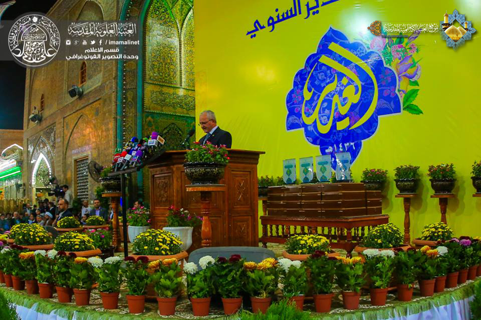وكانت في تلك الأجواء المعطرة بأريج الولاية كلمة للأمانة العامة للعتبة الكاظمية المقدسة ألقاها أمينها العام أ. د جمال عبد الرسول الدباغ تحدث فيها قائلاً: "إن الأمم والشعوب دأبت على أن تجعل لها أعياداً ومناسبات تشير بصورة أوأخرى إلى حدث مهم في حياة تلك الأمة أو ذلك الشعب ليكون ذلك العيد مقياسا لمدى وعي الأمة وعمق تفكيرها ونوع عقيدتها، ولا يرتاب احد بأن أفضل الأعياد ما كان له ارتباط بالخالق عزَّ وجل وشرِّع من قبله سبحانه . ومن هذا المنطلق كانت أعيادنا الإسلامية قد امتازت بهذه المزية الشريفة ".