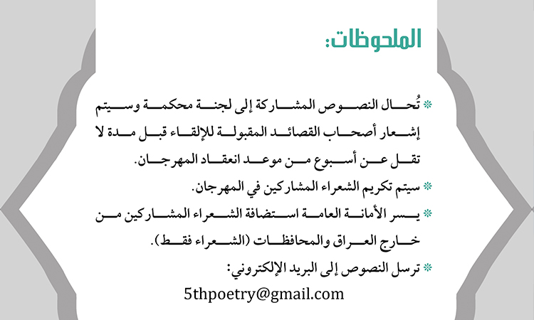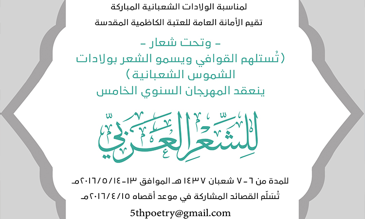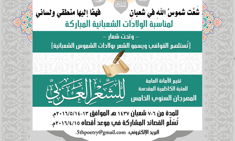 تواصل الأمانة العامة للعتبة الكاظمية المقدسة مشروعها الثقافي ومشوارها في دعم الحركة الأدبية والفكرية، إيماناً منها بضرورة الاهتمام بالإبداع والمبدعين والأدباء والشعراء والمثقفين، حيث أعلنت اللجنة التحضيرية للمؤتمر العلمي الدولي السابع إقامة المهرجان السنوي الخامس للشعر العربي تحت شعار: (تُستلهم القوافي ويسمو الشعر بولادات الشموس الشعبانية) للمدة من 6ـ 7 شعبان 1437هـ الموافق 13 ـ 14 آيار 2016م، وبينّت اللجنة التحضيرية أن القصائد تُسَلّم في موعد أقصاه 15 نيسان 2016 إلى البريد الإلكتروني: 5thpoetry@gmail .com