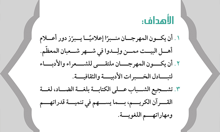 ومن الجدير بالذكر أن اختيار اللجنة التحضيرية للولادات الشعبانية المباركة عنوان المهرجان الشعري لهذا العام هو استذكاراً لأعلام أهل البيت "عليهم السلام" الذين ولدوا في هذا الشهر المعظّم ومسيرتهم الخالدة التي رسمت لنا سبل النجاة.