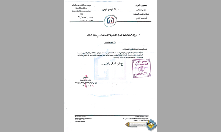 تقدمت هيئة دعاوى الملكية ببالغ الشكر والتقدير إلى الأمانة العامة للعتبة الكاظمية المقدسة وملاكات قسم حفظ النظام في وحدة السونار ووحدة الكاميرات لجهودهم المباركة وتعاونهم مع الهيئة في أداء مهامها، متمنين لها المزيد من العطاء في خَدمَة الإمامين الجوادين "عليهما السلام" وزائريهم الكرام.