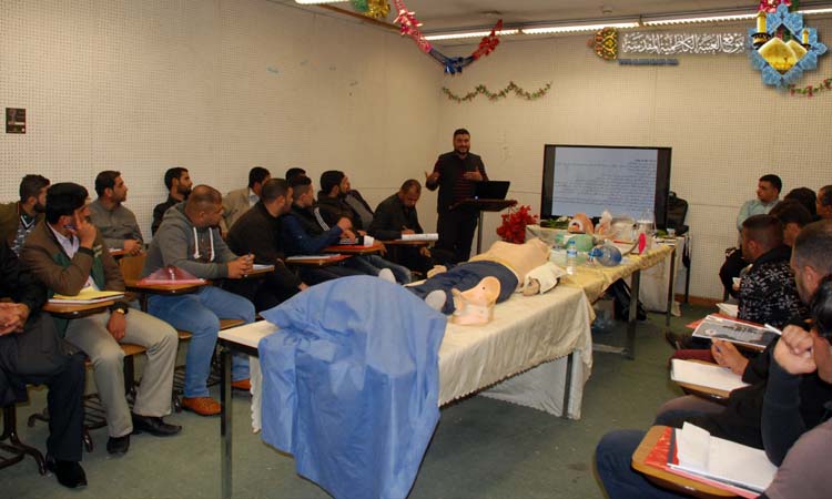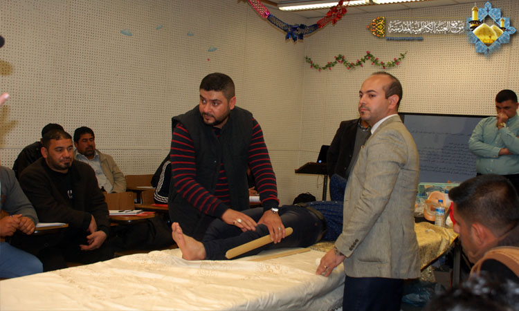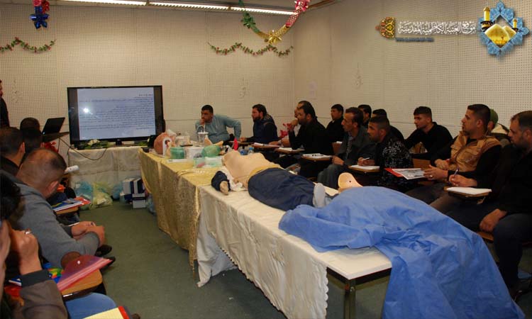 وفق مبدأ تقليل الدماء وحصر الخسائر في معارك التحرير، ومن منطلق دعم الحشد الشعبي بكافة الوسائل المادية والمعنوية، زار وفد العتبة الكاظمية المقدسة الدورة التعليمية والتأهيلية الثالثة التي أقامتها مديرية طبابة في هيئة الحشد الشعبي للمدة من 7ـ 14 شباط 2016، تحت شعار: (المسعف الحربي) بالتعاون والتنسيق مع كلية الطب/ جامعة النهرين، لتعليم مجاميع منتخبة ومختارة من عناصر الحشد الشعبي المبادئ الطبية والإسعافات الأولية، وتأهيلهم لهذا الغرض بغية رفد أرض المعركة بكوادر ميدانية تقوم بعملية إسعاف وإخلاء الجرحى والمصابين في أرض المعركة، كما تتضمن هذه الدورة محاضرات نظرية وتطبيقية يقوم بإلقائها كادر طبي متخصص، طيلة أيام الدورة، وقد بلغ عدد المشاركين في هذه الدورة (48) عنصر من مختلف تشكيلات قوات الحشد الشعبي وكان من بينهم عناصر قوة الكاظمين القتالية، ومديرية الشهداء والجرحى، ومديرية الدعم اللوجستي، وكتيبة النخبة، ومديرية التعبئة، ومديرية الهندسة العسكرية في هيئة الحشد الشعبي.