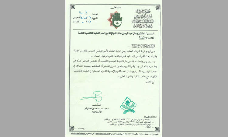 الأمانة العامة للعتبة العباسية المقدسة تتقدم بالشكر والتقدير إلى الأمين العام للعتبة الكاظمية المقدسة