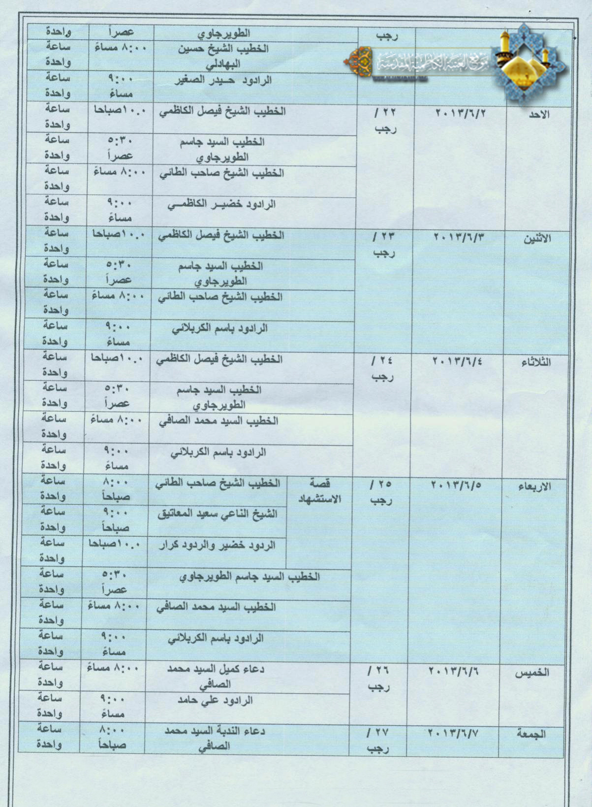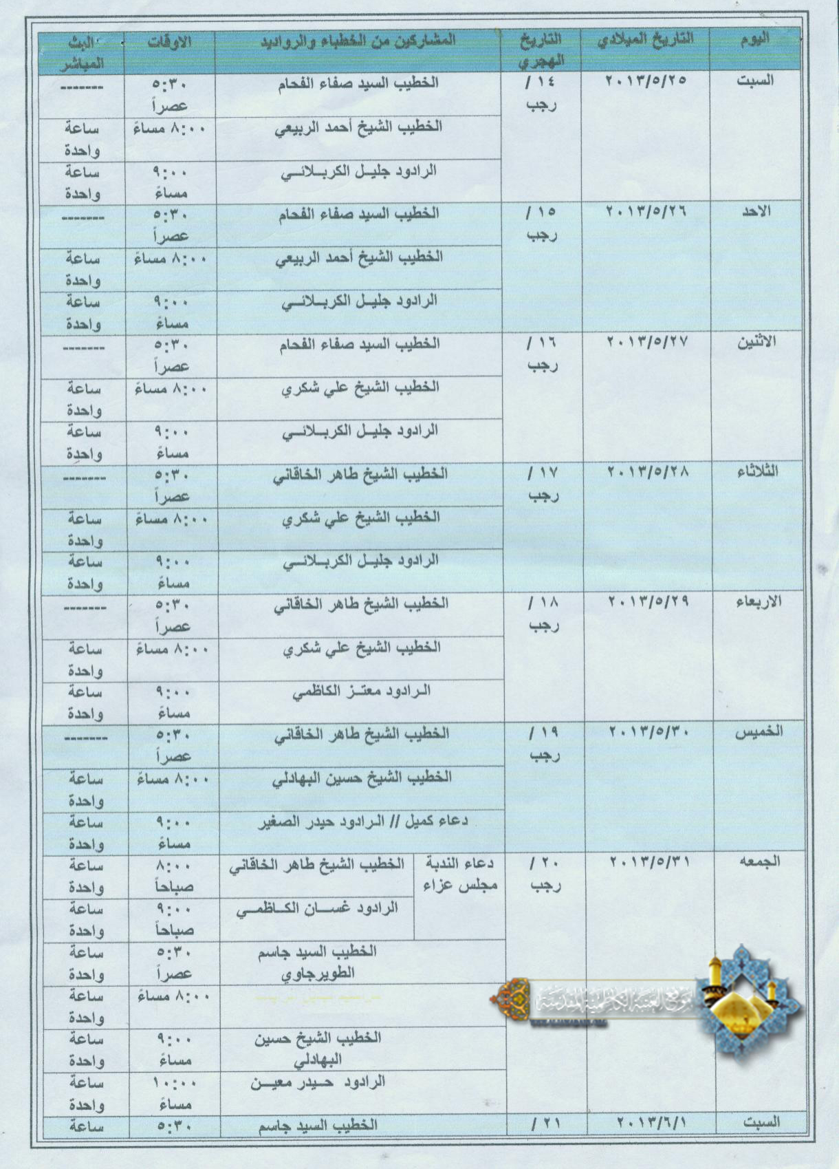 إحياءً لذكرى استشهاد حليف السجدة الطويلة الإمام موسى بن جعفر الكاظم(ع), أعدت الامانة العامة للعتبة الكاظمية المقدسة وضمن استعداداتها المبكرة لهذه المناسبة الاليمة منهاجاً خاصاً مكثفاً وحافلاً بالنشاطات الدينية , ويشمل إقامة مجالس العزاء الحسيني في رحاب الصحن الكاظمي الشريف, حيث بدأ للفترة من يوم السبت المصادف 14 رجب 1434هـ والموافق 25/5/2013م ويستمر الى يوم الجمعة 27 رجب, 7/6/2013 بحضور نخبة من خطباء المنبر الحسينيي الشريف ومن ابرزهم السيد (جاسم الطويرجاوي, والسيد محمد الصافي, والشيخ الناعي سعيد المعاتيق, والشيخ فيصل الكاظمي) ومشاركة عدد من الرواديد الحسينيين من بينهم الحاج (جليل الكربلائي, والحاج باسم الكربلائي, وخضير الكاظمي ...) . علماً انه سيكون البث المباشر لبعض منهاج العزاء الحسيني في العديد من القنوات الفضائية وكذلك عبر الموقع الرسمي للعتبة الكاظمية المقدسة وكما مبين في الجدول ادناه, وعظم الله أجورنا وأجوركم بهذا المصاب الجلل
