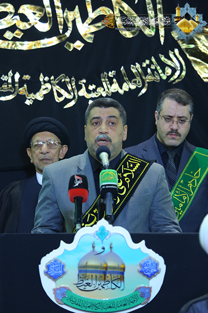 تلته كلمة السيد الأمين العام التي ابتدأها بعبارات التعزية والمواساة للإمام موسى بن جعفر الكاظم ع وللإمام المنتظر عجل الله فرجه الشريف ولمراجع الدين العظام بهذا المصاب الجلل, مشيراً الى عظم هذه الذكرى الاليمة وبدء أيام العزاء والحزن في هذه البقعة الطاهرة والتي نستذكر من خلالها كل القيم الانسانية الرسالية التي ضحى من اجلها الامام الكاظم, كما أكد على ضرورة الالتزام بنهج ووصايا أهل البيت(ع) واحياء ذكرهم العطر من خلال افشاء لغة السلام والتسامح والمحبة لنحيا حياة طيبة ملؤها الاحترام والمساواة, واشار الى ضرورة ان يكون خادم الامامين الجوادين بمستوى هذه المكانة التي يحظى بها وهي مسؤولية شرف الخدمة وهو شعار كل مؤمن, ثم تطرق الى مناقب الإمام السابع من أئمة الهدى عليهم السلام وما لاقاه من جور وظلم سلطة بني العباس الحاكمة التي حاربت الخط الرسالي والمدرسة الإلهية لأهل بيت الرحمة (ع), واشار الى ما أعدته العتبة الكاظمية لإحياء مراسم هذه الفاجعة الأليمة بعدها جرت مراسم استبدال الرايات في أجواء خيم عليها الحزن والأسى حيث َتجدُد احزان أهل البيت(ع) مع قرب حلول الخامسة والعشرين من شهر رجب الأصب. بعدها القى سماحة الشيخ (مكي آل شطيط الطائي) محاضرة جاء فيها: اليوم يرفع الموالون في العراق والعالم الاسلامي شعار الحداد والمواساة في ذكرى استشهاد امام عظيم فرض الله طاعته ومودته ومحبته, وحري بنا ان نتمسك بنهجه فهو من اهل بيت عرفوا بعصمتهم ومكانتهم الرفيعة عند الله والحق معهم وفيهم وبهم, فامامنا الكاظم(ع), يعلمنا كيف نقيم الصلاة ونأمر بالمعروف وننهى عن المنكر, وكيف نميز بين الحق والباطل وهو الرحمة المهداة بعد جده النبي الأكرم(ص) وآبائه الاطهار(ع), تلى ذلك القاء قصيدة لشاعر أهل البيت سماحة الشيخ (احمد الدر العاملي) خلدت صاحب الذكرى الاليمة والتي رسم فيها صورة رائعة عبرت عن مدى الحزن والألم الذي أصاب نفوس موالي أهل البيت بفقدان الإمام موسى بن جعفر الكاظم(ع) الذي كان نبراسا يستضاء به في ميادين العلم والمعرفة واستمرت فقرات مراسم العزاء بالمراثي الحسينية التي شارك فيها الرادود حيدر الصغير وكرار الكاظمي .