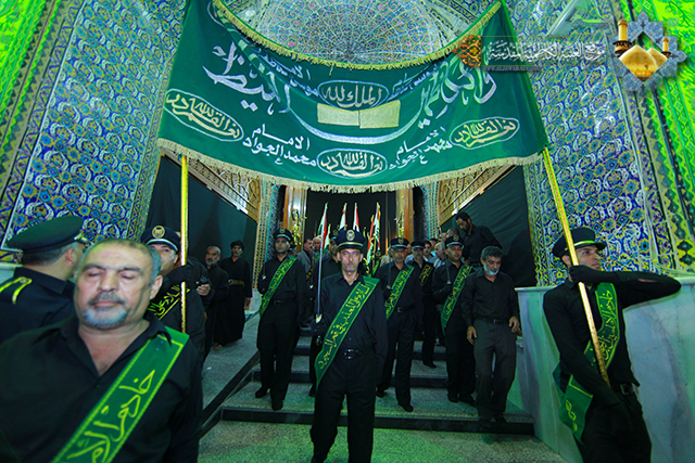 إيذانا ببدء موسم الحزن والأسى لمناسبة الذكرى الأليمة لاستشهاد الإمام موسى بن جعفر الكاظم (ع) ومواساة للرسول الأكرم وآل بيته الأطهار(ع) ,أقيمت في رحاب الصحن ألكاظمي المطهر مراسم استبدال رايتي قبتي الإمامين الجوادين (ع) برايات الحزن السوداء في مراسم مهيبة جرت بحضور السيد الأمين العام للعتبة الكاظمية المقدسة الأستاذ الحاج (فاضل الانباري) وعدد من السادة أعضاء مجلس الإدارة والسادة رؤساء الأقسام وجمع غفير من الزائرين حيث بدأت المراسم بتلاوة معطرة من آي الذكر الحكيم شنف بها أسماع الحاضرين القارئ السيد (حيدر جواد الموسوي)