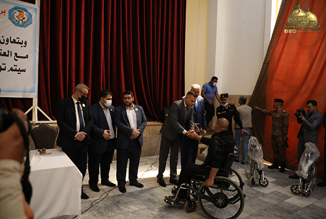 تزامنا مع ذكرى ولادة الموعود من آل محمد، صاحب الأمر الإمام المهدي المنتظر "عجل الله فرجه الشريف"، والذكرى السنوية السابعة لانطلاق فتوى الدفاع الكفائي المباركة، وجّه الأمين العام للعتبة الكاظمية المقدسة خادم الإمامين الكاظمين الجوادين الدكتور حيدر حسن الشمّري بإهداء مجموعة من الكراسي الطبية المتحركة إلى الشهداء الأحياء ذوي الاحتياجات الخاصة من جرحى قواتنا الأمنية البطلة من الضباط والمراتب في وزارة الداخلية بالتعاون والتنسيق مع مديرية شؤون الشهداء والجرحى في حفل أقيم بحضور الوكيل الأقدم لوزارة الداخلية الأستاذ حسين العوادي ووفد العتبة المقدسة وعدد من القيادات الأمنية، وذلك وفاءً وافتخاراً بهذه الثلة المؤمنة الذين نالوا وسام شرف التضحية والنصر والفداء في ساحات العزّة والشرف، ورخصوا أرواحهم ودماءهم من أجل الدفاع عن أرض العراق ومقدساته.