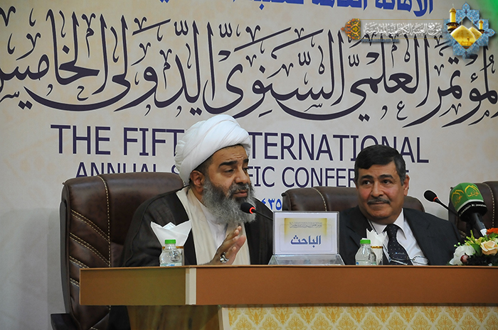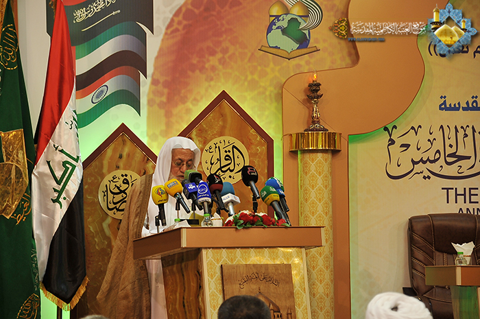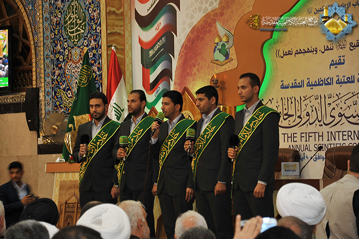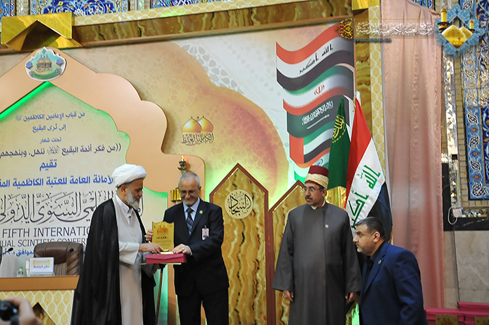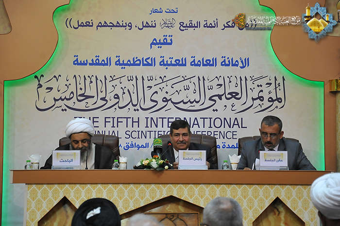 من ذرى الولاء من ديار كرم الإمامة وفيضها الزاخر من معين مدرسة الكاظمين الإنسانية المعطاء انطلقت وعلى بركة الله عصر يوم الخميس 2014/5/8م الموافق 8 رجب 1435هـ ، فعاليات المؤتمر العلمي السنوي الدولي الخامس في رحاب الصحن الكاظمي الشريف تحت شعار: "من فِكرِ أئمة البقيع(عليهم السلام) نَنْهَل، وبنهجهم نعمل" والذي يستمر على مدى يومين متتاليين برعاية الأمانة العامة للعتبة الكاظمية المقدسة، وافتتحت فعالياته بحضور معالي رئيس ديوان الوقف الشيعي سماحة السيد "صالح الحيدري" والأمين العام للعتبة الكاظمية المقدسة أ.د "جمال الدباغ" ومعالي وزير التعليم العالي والبحث العلمي د."علي الأديب" وممثلي العتبات المقدسة والمزارات الشيعية الشريفة وعدد من الشخصيات الأكاديمية البارزة وعمداء الجامعات العراقية ونخبة من رجال الدين وفضلاء الحوزة العلمية الشريفة من داخل العراق وخارجه والمتمثلة بمشاركة "جمهورية إيران الإسلامية والسعودية والهند والبحرين"، وبدأت وقائعه بتلاوة مباركة من كتاب الله العزيز عطر بها قارئ العتبة الكاظمية المقدسة الحاج "همام عدنان" أسماع الحاضرين بعدها استمع الحاضرون إلى أنشودة العتبة الكاظمية المقدسة وشهدوا عرضاً لفلم وثائقي عن دور اللجنة التحضيرية وأعمالها واستعداداتها للمؤتمر العلمي الخامس، بعدها جاء دور كلمة الأمانة العامة للعتبة الكاظمية المقدسة ألقاها أمينها العام أ.د "جمال الدباغ" تحدث فيها قائلاً: (للعتبة الكاظمية المقدسة شرف المشاركة بإيصال تعاليم القران الكريم والسنة الشريفة التي تنقذُها من الحيرة والضلالة إلى ربوع اليقين والهداية، ومؤتمرنا العلمي السنوي الدولي هو احد تلك المحطات المهمة لنشر العلم والتعلم، وثقافة القراءة والقرطاس والقلم والدعوة إلى إحياء سنن الائمة "عليهم السلام: وتراث علمائنا الأعلام، وحاول خَدَمَة العتبة المقدسة أن يشاركوا في إحياء هذه الرسالة العظيمة كلّ عامٍ في شهر رجبٍ الحرام، شهر استشهاد الإمام السابع موسى بن جعفر "عليه السلام" فيدلو كل بدلوه، فنرى صوراً مشرقةً عن الحب والولاء للأئمة"عليهم السلام" تمثل المسيرة المليونية نحو قبر كاظم الغيظ باب الحوائج لتنال شرف الزيارة وتعظيم الشعائر وصورة تمثل الحب والتفاني في خدمة الزائرين وصورة وتمثل التلاقح العلمي والفكري في رحاب علومهم (صلوات الله عليهم) وصورة .. وصورة..