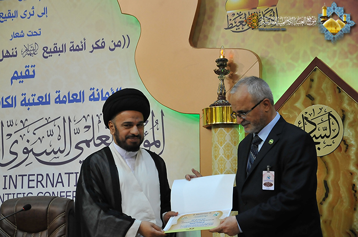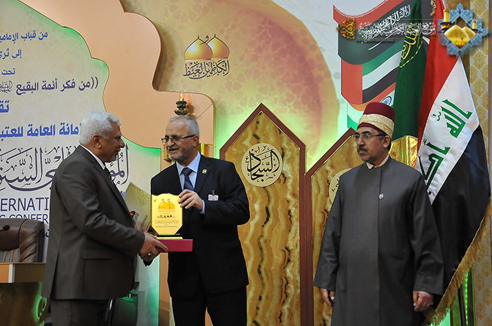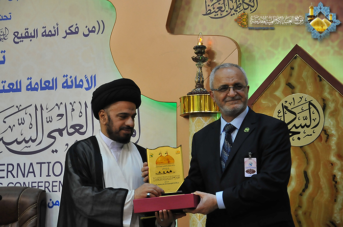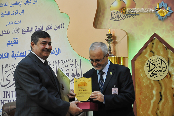 مضيفاً: الذي يعزز الأمل ويفتح القلوب أن الباحثين من مختلف المذاهب الإسلامية بدأوا بدراسة فكر الأئمة "عليهم السلام" بتجرد وبموجب موازين علمية، واعتمدوا على الدراسات التي لا يرتقي إليها الشك في النهج القويم للأئمة الطاهرين والسير السليم للعلماء الأعلام والوقوف على الواقع في الاطلاع على حقيقة المعتقدات والأفكار التي يتبناها علماء الشيعة، أدى ذلك إلى نبذ الأكاذيب والعودة إلى زرع روح الأخوة والتسامح وبموجب معايير البحث العلمي وبدأت المؤلفات والبحوث التي تجمع الأمة وتقرّب بين أتباعها وتحترم الفكر ولا تخشاه، وهو نهج يسرُ الجميع ويشكل قوةً إسلامية فاعلة من أجل طرح الأكاذيب والأباطيل ، وتكريس المناهج التي تتخذ من الأعتدال في البحث بعيداً عن التطرف والتقصي، ونحن وكثير من كتّاب المذاهب الإسلامية في هذا الطريق سائرون، من أجل كلمة الإسلام ورفع راية القرآن الكريم عالياً..)، ثم ارتقى المنصة وزير التعليم العالي والبحث العلمي الدكتور "علي الأديب" ألقى كلمة بهذه المناسبة ومنها:( أتوجه بالشكر والتقدير لكل من أسس وسعى لهذا النشاط المبارك والفعاليات المتزامنة معه، حيث اجتمعت اليوم المؤسسات العلمية والثقافية وهي بحاجة ماسة لهذه الأنشطة، وأملي كبير بأن تكون النتائج التي تتمخض من هذه المؤتمرات والاجتماعات أن تنعكس بشكل عملي على مؤسساتنا التربوية والتعليمية، بحيث يمكن الأخذ بنتائجها، واليوم ركزت الأمانة العامة للعتبة الكاظمية المقدسة في مؤتمرها العلمي على أئمة البقيع "عليهم السلام" لتساهم هذه الرسالة الموجهة للإنسانية عامة وللمسلمين خاصة، بأن هذه الثلة من الأئمة والقادة هم الأسوة والانموذج، والبشرية تحتاج إلى قيمها ومبادئها وفي جميع نواحي الحياة الاجتماعية والسياسية والشؤون العامة لتنظيم علاقاتها البشرية..