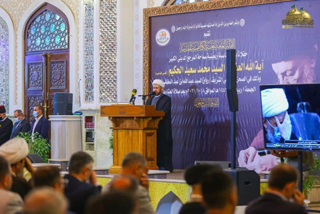 بعدها كلمة لممثل المرجعية الدينية في مدينة الكاظمية المقدسة سماحة الشيخ حُسين آل ياسين "دامت توفيقاته" قائلاً:(تحية وتعزية من شغاف القلب وكأني بسيدنا الأستاذ الحكيم "رضوان الله عليه" يقول معرّفاً بنفسه الزكية: " هاؤم اقرأوا كتابيه أني ظننت ملاقٍ حسابيه، كدحت إلى ربي كدحاً، وقُلت لهُ ربِ زدني علماً، بعد أن رباني أبواي زرعاً أخرجَ شطأه فآزره فاستغلظ فاستوى على سوقهِ يُعجب الزُرّاع ليغيظ به الكفار)، نعم لم يجد الكسل ولا الممل ولا طول الأمل إلى قلبه طريقاً، وبالتالي لم يكن لديه شك لله، أبوه إذ لقبه سعيدا، سعيد وأي سعيد حتى في قعر السجون وأشد التعذيب، سعيد بحقيقة الإيمان بالله الواحد الأحد الفرد الصمد والذل له تعالى، سعيد بحقيقة الإيمان بأحمد "صلّى الله عليه وآله وسلم"، سعيد بحقيقة الإيمان بالعترة الطاهرة وفكرهم وسنتهم تعلماً وتفقهاً وتعمقاً وتعليماً وتفهيماً وتأليفاً ونشراً، سعيد بإعلانه الدائم بأن العصمة إنما هي لأهل العصمة "عليهم السلام" وأننا صنايع لهم، وهم صنايع ربهم ولا يقاس بهم أحد، سعيد بجوار أمير المؤمنين "عليه السلام" واللوذ به والاستمرار بتعمير حوزته التليدة، وحُب شيعته وخدمتهم بعيداً عن زخارف الدنيا ومغرياتها وأهواء الساعين إليها، برؤية منضبطة موروثة ثابتة تؤتي أُكلها كلّ حين بإذن ربها ورعاية الإمام المهدي "عجل الله فرجه الشريف").