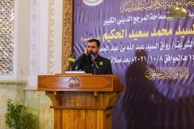 لمناسبة ذكرى مرور أربعين يوماً على رحيل المرجع الديني الكبير سماحة آية الله العظمى السيد محمد سعيد الطباطبائي الحكيم "طيب الله ثراه"، أقامت الأمانة العامة للعتبة الكاظمية المقدسة مجلساً تأبينياً، وكان في استقبال المعزّين خادم الإمامين الكاظمين الجوادين، الأمين العام للعتبة الكاظمية المقدسة الدكتور حيدر حسن الشمّري، وأعضاء مجلس إدارته الموقر وخدّام العتبة المقدسة، وممثل المرجعية الدينية في مدينة الكاظمية المقدسة سماحة الشيخ حُسين آل ياسين، ونجل الفقيد سماحة السيد رياض الحكيم، وكوكبة من السادة من أسرة آل الحكيم المباركة، وحضر المجلس العزائي وفود العتبات المقدسة والمزارات الشريفة، ومسؤولي رئاسة ديوان الوقف الشيعي، وكوكبة من السادة الأجلاء والمشايخ الفضلاء ونُخبة من الشخصيات العلمية والأكاديمية والاجتماعية.
