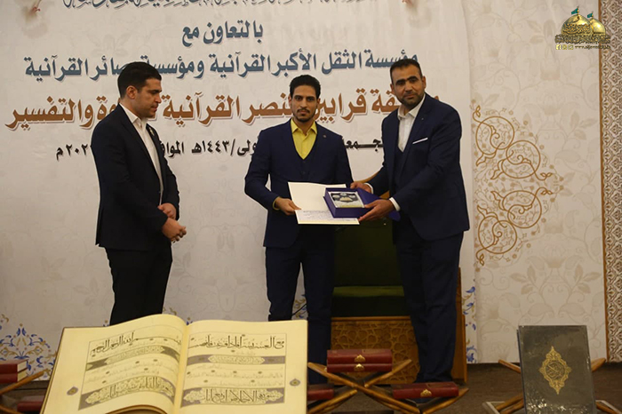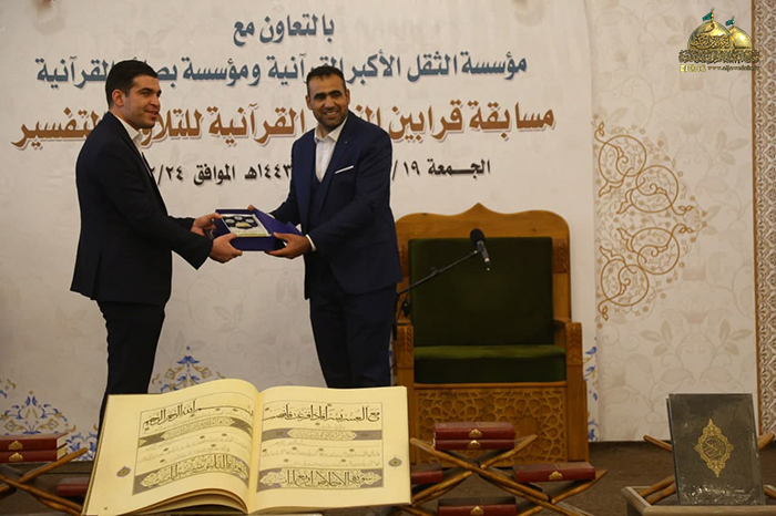 في ذُرى المجد والولاء وديار كرم الإمامة وفيضها الزاخر، ومن بقعة الطهر المُفعمة بالقداسة والإيمان رحاب الإمامين موسى بن جعفر الكاظم ومحمد بن علي الجواد "عليهما السلام" استضيفت فعاليات مسابقة قرابين النصر القرآنية للتلاوة والتفسير التي أقيمت برعاية الأمانة العامة للعتبة الكاظمية المقدسة/ مركز القرآن الكريم التابع لقسم الشؤون الفكرية والثقافية، بالتعاون مع مؤسسة الثقل الأكبر القرآنية، ومؤسسة بصائر القرآنية بحضور نخبة من ممثلي المؤسسات والروابط القرآنية والمهتمين بالشأن القرآني.
