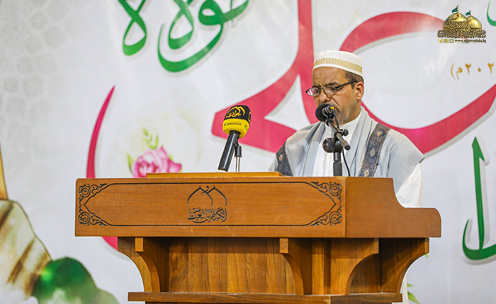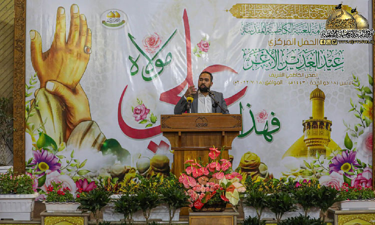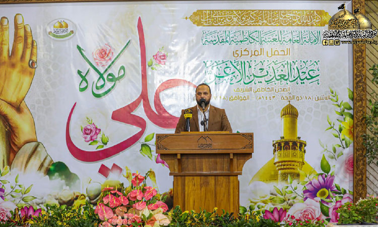 وأضاف: أن واقعة الغدير واقعة غضة طرية مهما تعاقبت عليها الأحقاب والأعوام وكأنها واقعة بالأمس، لا تبليها الحوادث أو تحرّفها الحكومات مهما حاولت ومهما سخرّت من جهود وطاقات في إخفاء حقيقتها، لأنها محل العناية السامية والرعاية المتواصلة من الله بما حفها من آيات بينات تتلى آناء الليل وأطراف النهار، وبما أولاها رسول الله "صلى الله عليه وآله وسلم" من عنايته واهتمامه، وبما سخر الله لها من ألسن الشعراء والمنشدين كي يلفت سبحانه وتعالى نظر الناس إلى ما يدينون به لله في باب خلافته الكبرى، وكي يُبقي حقيقة الغدير بوجهها الجميل حقيقة ناصعة ثابتة بعيدة عن التغيير والنسيان وسيقى شذاها قائما يجوب أجواء السنين حتى يأذن الله تعالى بظهور ولده الحجة بن الحسن عجل الله تعالى فرجه الشريف ليملأ الأرض قسطا وعدلا بعدما ملئت ظلما وجورا). وكان للشعر نصيب في الحفل المبارك حيث ألقى الشاعر الأديب السيد نبيل أبو العيس الكاظمي قصيدة ولائية رائعة بعنوان (غديرية الإمام علي) ومن أبياتها: