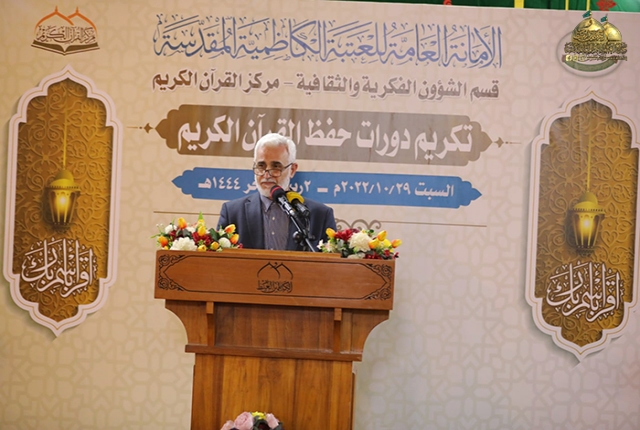 بعدها كلمة مركز القرآن الكريم وألقاها مديره السيد عمار الموسوي جاء فيها قائلاً: (ونحن إذ نحتفي اليوم بهذه النخبة الطيبة من الحفظة نود أن نبين بعض الأمور: أولها: أن مركز القرآن الكريم في العتبة الكاظمية المقدسة أخذ على عاتقه احتضان أبنائنا من الفتيان والفتيات ممن يرغبون في مواصلة حفظ القرآن الكريم ابتداءً من الجزء الواحد وانتهاءً بالثلاثين جزءً منذ انطلاق المشروع القرآني في العتبة المقدسة، ثانياً: مع تنوع دوراتنا القرآنية بكل تفاصيلها لا زال مركز القرآن الكريم  يولي اهتماماً بالغاً بدروس الحفظ ساعياً إلى تطويرها وزيادتها كماً ونوعاً أملاً في خلق جيل حافظ متقن لما حفظه إلى جانب إتقانه لمخارج الحروف وأحكام التلاوة وغيرها من الأمور التي ينبغي للحافظ مراعاتها.