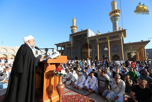 وأمَّ جموع المُصلين ممثل المرجعية الدينية العُليا في مدينة الكاظمية المقدسة سماحة الشيخ حُسين آل ياسين "دامت توفيقاته"، مستهلا الخطبة بعد الصلاة بدعاء الإمام علي بن الحسين زين العابدين "عليه السلام": (اللّهم فأوزع لوليك شكر ما أنعمت عليه وأوزعنا مثله قبله، وآته من لدنك سلطانا نصيرا، وافتح له فتحا يسيرا، وأعنه بركنك الأعزّ، واشدد أزره وقوّ عضده وراعه بعينك واحمه بحفظك وانصره بملائكتك وامدده بجندك الأغلب وأقم به كتابك وحدودك وشرائعك وسنن نبيّك ورسولك عليه وآله السّلام)، نعم يا ربي لبيك وسعديك والخير كله بين يديك والشر ليس إليك، ودعا في معرضها إلى ضرورة الرجوع إلى الله والقرب من مالك الملك والتعلق بحبال أستاره والتوبة إليه واتباع أحكامه.