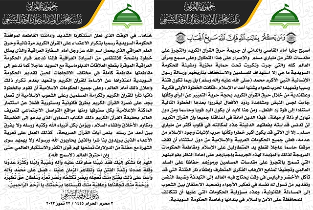 ختاما.. في الوقت الذي نعلن استنكارنا الشديد وإدانتنا القاطعه لموافقة الحكومة السويدية رسميا بتكرار الاعتداء على القرآن الكريم مرة ثانية وحرق العلم العراقي الذي يحمل اسم الله عز وجل أمام السفارة العراقية والذي يمثل خطوة واضحة للانتقاص من السيادة العراقية فإننا ندعم قرار الحكومة العراقية الموقرة بقطع العلاقات الدبلوماسية مع السويد عاجلا كما ندعو إلى مقاطعتها مقاطعة كاملة في مختلف الاتجاهات لحين تقديم الحكومة السويدية اعتذراها عن الإساءة للقرآن الكريم والتعهد بعدم تكرار ذلك وإعلان ذلك أمام العالم، وعلى جميع الحكومات الإسلامية أن تقوم بالخطوة ذاتها ثأرا للقرآن الكريم ولكرامة المسلمين وعلى الشعوب الإسلامية أن تعمل بجد على نصرة القرآن الكريم بطرق قانونية ودستورية فضلا عن استثمار الماكنة الإعلامية بكل صنوفها ومنها مواقع التواصل الاجتماعي لتعريف العالم بحقيقة القرآن الكريم ذلك الكتاب السماوي الذي يدعو إلى الفضيلة ومكارم الأخلاق وإفشاء السلام، ويؤمن بكل أنبياء الله وكتبه ورسله ولا يفرق بين أحد من رسله بنص آيات القرآن الصريحة، كذلك العمل على تعرية الأعداء الذين يريدون بنا شرا والذين يحاربون الله ورسوله ولا يهمهم سوى الشهرة مع حفنة من الدولارات تمنحها لهم قوى الكفر والاستكبار العالمي حتى وإن احترق العالم (لاسمح الله).