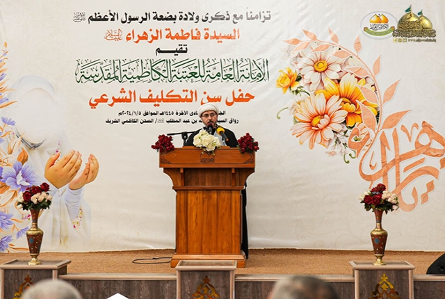 وأشار إلى أهمية التكليف الشرعي قائلاً: (علينا أن نتخذ من مبدأ سيدة النساء الزهراء "عليها السلام" منهاجاً لحياتنا ونجعلها أسوتنا وقدوتنا الحسنة فنقتفي أثرها ونسير في هداها، حيث كانت الصديقة "عليها السلام" صادقة بالقول والفعل وشديدة الالتزام بالعفاف والحجاب، لأنه رمز عفة المرأة وعنوان قيمتها الحقيقية فيتوجب أن نربي بناتنا العزيزات على خصالها وتطبيق رسالتها الإنسانية والتربوية.