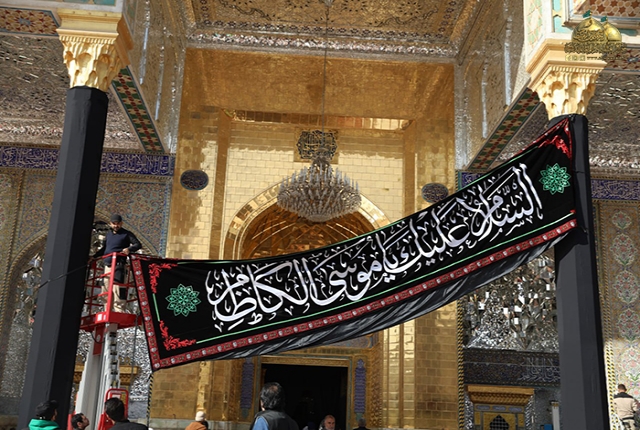 حري بالدنيا أن تتشح بالسواد لذكرى استشهاد أسد بغداد الإمام موسى بن جعفر الكاظم "عليهم السلام"، نعم هكذا شاء أن ‏نستقبل هذه المناسبة الأليمة ونحن نستذكر فاجعة تدمي قلوب محبي وأتباع أهل البيت "عليهم السلام" في مشارق الأرض ومغاربها، إذ اتَّشحت العتبة الكاظمية المقدسة بمظاهر الحزن والأسى ونشر السواد والكلمات النورانية على أعمدة الطارمات والأواوين في الصحن الكاظمي الشريف.