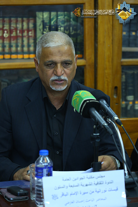 تزامناً مع الذكرى الأليمة لاستشهاد باقر علوم الأولين والأخرين محمد بن على الباقر "عليه السلام"، أقامت مكتبة الجوادين العامة في رحاب الصحن الكاظمي الشريف ندوتها الشهرية السابعة والستين بعنوان: (قبسات نورانية من حياة الإمام محمد بن علي الباقر "عليه السلام") مساء يوم الخميس 2/10/2014م ، وبحضور الأمين العام للعتبة الكاظمية المقدسة أ. د "جمال الدباغ" والعديد من الشخصيات الاجتماعية والعلمية والثقافية والأكاديمية، حيث استهلت الندوة بتلاوة مباركة من الذكر الحكيم شنف بها القارئ السيد " عبد الكريم قاسم " أسماع الحاضرين، بعدها ألقى الباحث "احسان العارضي " محاضرته التي تحدث فيها عن خامس الأئمة الوصيين باقر علم النبيين "عليه السلام"، وتطرق فيها إلى ثلاثة محاور كان أولها لمحات عن الحياة السياسية في عصر الإمام "عليه السلام" والمجال الإنساني وحياته الفكرية العلمية" عليه السلام" منطلقاً في بحثه بالعبارة التي وردت في القرآن الكريم " الأسوة الحسنة" مؤكداً على ضرورة الاقتداء بمُشيّد معالم مدرسة أهل البيت "عليهم السلام" الذي أرسى قواعدها بين الفرق والملل والنحل، كما تناول جانباً من مولده الشريف "عليه السلام"، بذكر بعض شهادات العلماء الأعلام. وشهدت الندوة مداخلات وأسئلة وتعقيبات من قبل السادة الحضور اسهمت في إغناء أجواء النقاش الذي ساد الندوة، واختتمت الندوة التي ترأسها سماحة الشيخ "عماد الكاظمي" بإلقاء القصائد الشعرية حيث أجاد الشاعر الأستاذ "محمد سعيد الكاظمي" بقصيدته التي عنوانها "يا صاحب العصر أدركنا " وقد نالت إعجاب الحاضرين وأفاض الشاعر "علي وداعة الشمري" بقصيدة رائعة ومطلعها: باقر العلم نبعة من نبيّ ووريث لباب علم عليّ علماء يستنجدوا فيه كانوا سائليه لأمر صعب عصيّ