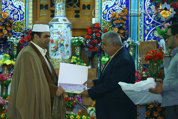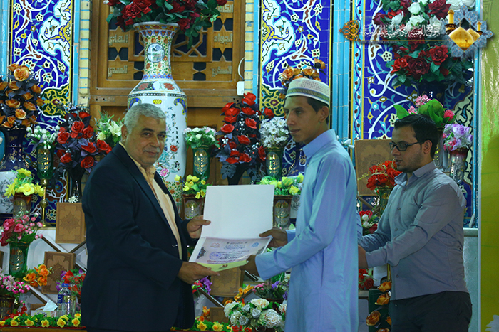 بمناسبة حلول عيد الغدير الأغر، يوم تجديد البيعة التي عقد لواءها النبي الأكرم محمد "صلى الله عليه وآله" بيده لعلي بن أبي طالب "عليه السلام" يوم الثامن عشر من ذي الحجة سنة 10هـ، وتتويجه أميراً للمؤمنين, وبهذه الذكرى العطرة أقامت الأمانة العامة للعتبة الكاظمية المقدسة، قسم الشؤون الفكرية والثقافية / دار القرآن الكريم، محفلاً قرآنياً في رحاب الصحن الكاظمي الشريف تليت فيه باقة من التلاوات القرآنية تنسمت بها أجواء الصحن الكاظمي الشريف، بمشاركة القارئ "حسام المنشداوي" والقارئ "سجاد فاضل"، وقارئ العتبة الكاظمية المقدسة الحاج "رافع العامري". وشهد إلقاء بعض الموشحات والأناشيد الدينية لفرقة الجوادين الإنشادية, بحضور عضو مجلس الإدارة سماحة الشيخ "عماد الكاظمي"، وجمع غفير من الزائرين الذين توافدوا على الروضة الشريفة لينهلوا من فيوضات الرحمة الإلهية لنيل الأجر والثواب الجزيل. كما تخلل برنامج توزيع الشهادات التقديرية على المشاركين والهدايا للفائز في فقرة السؤال القرآني .