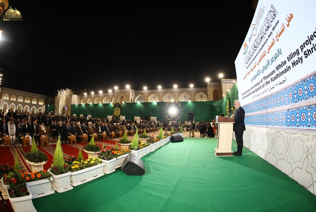 استهل الحفل بتلاوة آيات من الذكر الحكيم بصوت القارئ السيد عبد الكريم قاسم، بعدها كلمة العتبة الكاظمية المقدسة التي ألقاها أمينها العام جاء فيها قائلاً: (قال تعالى: (لَن تَنَالُوا الْبِرَّ حَتَّىٰ تُنفِقُوا مِمَّا تُحِبُّونَ وَمَا تُنفِقُوا مِن شَيْءٍ فَإِنَّ اللَّهَ بِهِ عَلِيمٌ) إذ سخر الله تعالى عبادا له من أتباع أهل البيت عليهم السلام للتبرع بهذا المشروع المبارك (بالمواد والعمل والعمال) من دون الالتفات إلى حجم الأموال.. ليكون تبرعهم الكريم على أعتاب الإمامين الكاظمين الجوادين وليكون تحت أقدام زائريهما الكرام وهو مشروع إكساء أرضية الصحن الكاظمي الشريف وقواعد القامات والأواوين بالمرمر المعروف باسم (الثاسوس) الأبيض الطبيعي اليوناني وهو ذات المرمر الموجود في أرضية الحرم المكي ومسجد الكوفة، ومن مواصفاته أنه عالي الجودة ويحافظ على برودة الأرضية لراحة وسلامة أقدام الزائرين الكرام.. مقارنة مع المادة السابقة من الكرانيت التي كان الزائر لا يستطيع المشي عليها في أيام فصل الصيف بسبب ارتفاع درجة حرارتها.. وهذه الجهود قدمتها مشكورة (منظمة الخوجا الدولية للمسلمين الشيعة الاثني عشرية) وهي الجهة المتبرعة.