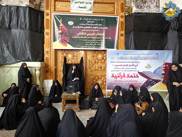 استذكاراً لواقعة الطف الأليمة ومواقفها وأحداثها وجوانبها التاريخية والمشاهد المروعة التي واجهتها عيالات رسول الله" صلى الله عليه وآله" التي يندى لها جبين الإنسانية، وإحياءً لشهر الأحزان محرم الحرام وعاشوراء الحسين "عليه السلام"، حرصت الأمانة العتبة الكاظمية المقدسة بهذه المناسبة الأليمة على وضع برنامج ديني ثقافي يساهم بالتوعية الدينية للزائرات ضمن فعاليات الملتقى الزينبي النسوي الثقافي المنعقد تحت شعار: (الثورة الحسينية عطاء لا ينضب), في رحاب الصحن الكاظمي الشريف "صحن قريش" وبواقع جلستين صباحية ومسائية للمدة من 1 – 13محرم، ويتضمن سلسلة من المجالس الدينية والمراثي الحسينية واستعراض بعض المسائل الخاصة بفقه الشعائر الحسينية لسماحة المرجع الديني الأعلى السيد علي الحسيني السيستاني "دام ظله الوارف"، إضافة إلى التطرق لبعض المسائل الابتلائية الخاصة بالنساء، والدروس الأخلاقية والعقائدية من الثورة الحسينية والمسيرة الجهادية لأم المصائب الحوراء زينب "عليها السلام"، وقراءة زيارة عاشوراء، وتوجيه أسئلة للزائرات رصدت لها جوائز من بركات الإمامين "عليهما السلام"، كما توزع على الحضور الكريم مطوية (نداء العقيلة) الصادرة من الملتقى الزينبي .