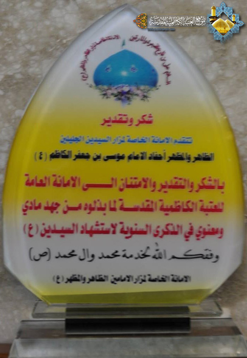 وفد مزار السيدين الظاهر والمظهر يقدمون درعاً إلى الأمانة العامة للعتبة الكاظمية المقدسة