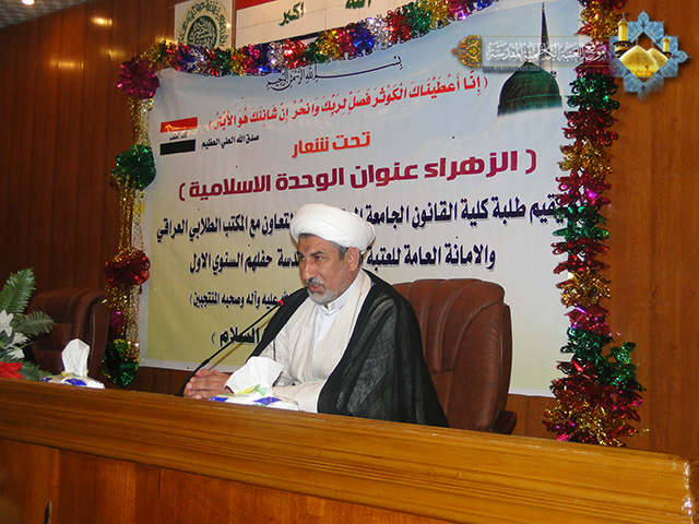 في خطوة تعكس مدى الاهتمام الذي توليه الأمانة العامة للعتبة الكاظمية المقدسة من أجل الانفتاح والتواصل مع المؤسسات العلمية والتربوية والفكرية والثقافية ومد جسور التعاون في نشر فكر وعقيدة آل البيت(ع) وترسيخ النهج المحمدي الأصيل, شاركت الامانة العامة للعتبة الكاظمية المقدسة وبتوجيه من امينها العام الحاج (فاضل الانباري) في الحفل السنوي الأول للذكرى العطرة لولادة بضعة النبي الأكرم (ص) فاطمة الزهراء(ع), الذي اقيم على قاعة كلية القانون تحت شعار(الزهراء عنوان الوحدة الاسلامية), برعاية طلبة كلية القانون في الجامعة المستنصرية وبالتعاون مع المكتب الطلابي العراقي, وكان للعتبة الكاظمية المقدسة حضور فاعل ومتميز في هذا الحفل المبارك الذي حضرته العديد من الشخصيات العلمية والاكاديمية والثقافية, حيث قدم فضيلة الشيخ (نجم الدراجي) الباحث في قسم الشؤون الفكرية والثقافية في العتبة المقدسة خلال المنهاج الذي اعد للحفل محاضرة دينية توجيهية تحدث فيها عن السيرة العطرة للصديقة الطاهرة فاطمة الزهراء(ع), وقدم شرحاً مفصلاً عن سورة الكوثر المباركة, كما وزعت العتبة الكاظمية المقدسة الهدايا للطالبات الملتزمات بالحجاب الاسلامي الشرعي .